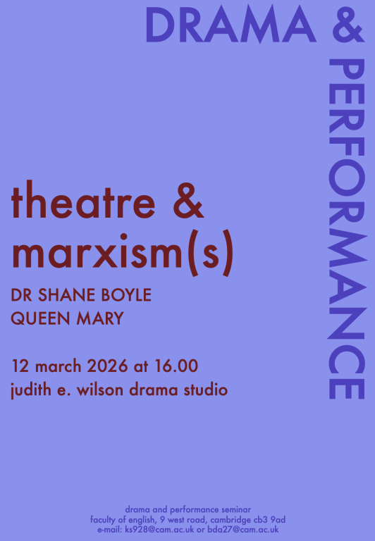 Please join us for the third meeting of the Drama and Performance Seminar which is taking place this week, on the 12th March 2026, at 16h00 in Judith E. Wilson Drama Studio at the Faculty of English.