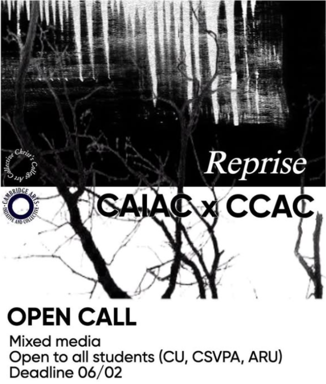 In collaboration with Christ's College Art Collective, CAIAC will be hosting an art exhibition evening in the King’s College Art Rooms and Munby room on the 27th February - our one-word theme: ‘Reprise’. We have extended an open call for all mixed-media submissions of art from any and all students in the Cambridge area: deadline EOD 06/02. The event will be free of charge, please join us for an evening of music and visual art!