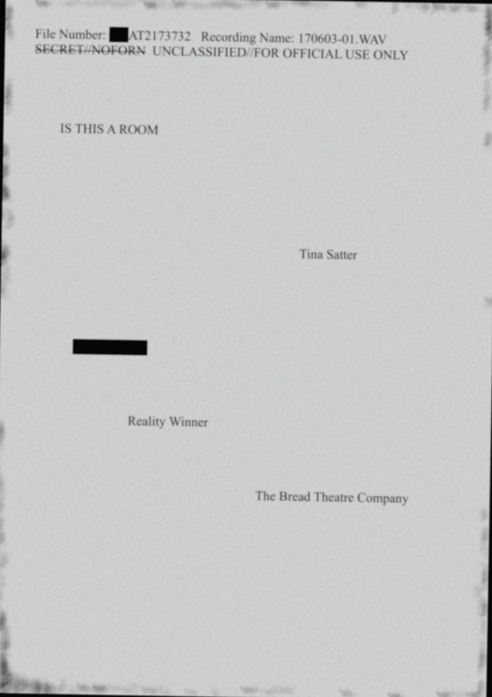 Taken verbatim from the transcript whistleblower Reality Winner’s interrogation, Is This a Room is a theatrical experience unlike any other. Reconstructed from recently declassified audio recorded at the scene, the play documents the landmark leak of a dossier pertaining to Russia’s interference in the 2016 US Elections and the ensuing repercussions. Blisteringly hot to the touch, Is This a Room is a bold piece at the cutting edge of experimental theatre which asks whether the personal can ever really escape the political.