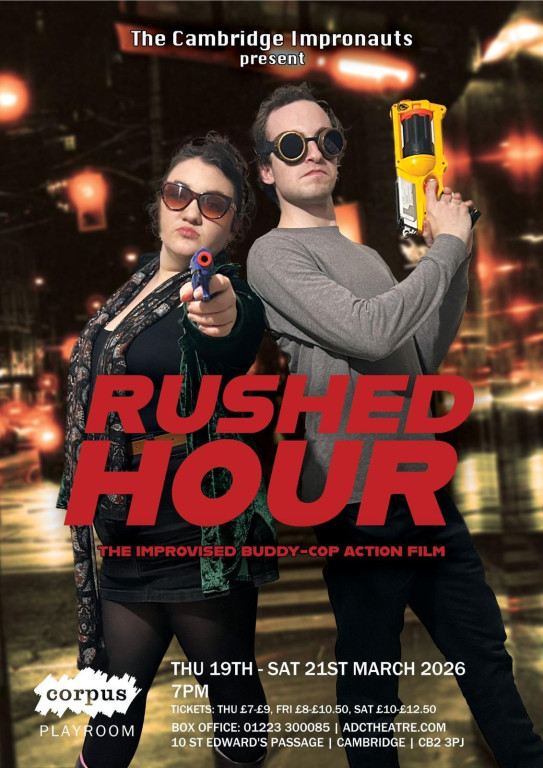 The Cambridge Impronauts invite you to this hour-long improvised buddy-cop performance, inspired by classics such Rush Hour, Lethal Weapon and Starsky & Hutch. We will be adapting your suggestions and prompts into an action-packed mystery full of drama, suspense, twists, turns, laughs, catchphrases, betrayals and all culminating in a finale where two police officers could form a friendship stronger than any conspiracy, super-weapon, or criminal mastermind plan.